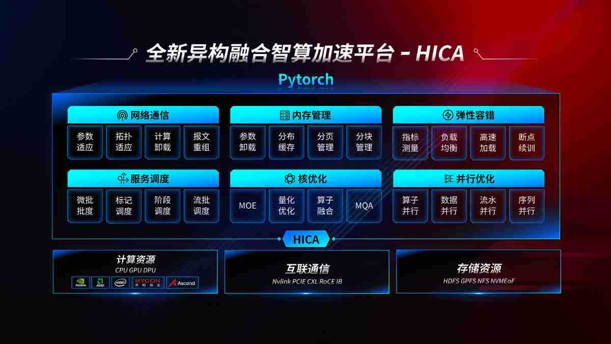 通过自研的服务层、、、中间适配层、、、以及调度编排算法,,,采用数据并行、、、模型并行等多种并行方式,,,把并行计算任务进行有效的分解,,,使其分别由相应的软件栈和算力资源来承接。。。。当GPU资源变化,,,,HICA可以实时动态调度计算子任务并调整模型拓扑和架构,,,,以充分聚合各种算力资源。。。