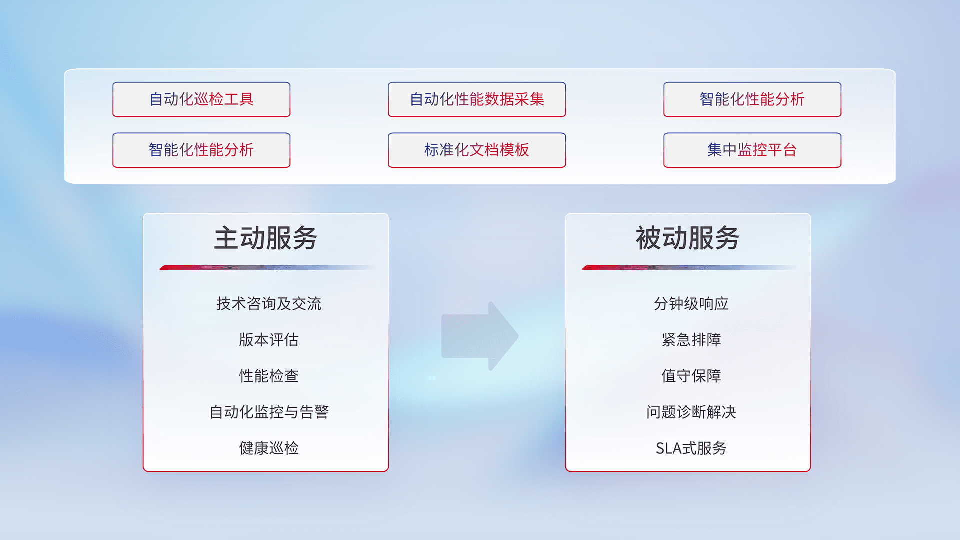 智能化工具和标准化文档,,保障服务质量,,提供主动服务(包含技术咨询、、、、版本评估、、、、性能检查、、自动化监控与告警、、健康巡检)和被动服务包含(分钟级响应、、、紧急排障、、值守保障、、、问题诊断解决、、、、SLA服务)。。